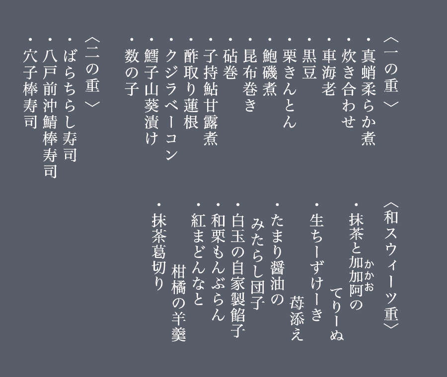 ※写真はイメージです。仕入れ等の都合により、内容が変更になる場合がございますので、ご了承ください。 - 発送は一段のおせちのみ承っております。