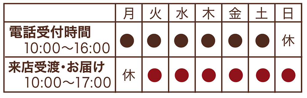 お届け時間 火曜~土曜 10:30〜17:00/日曜・祝 10:30~14:00