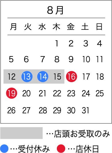 • 8/16(金)・8/19(日):店休日とさせていただきます。