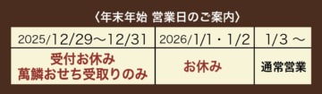 12/29(月)〜 31(水):受付をお休みさせていただきます(萬鱗おせち受取りのみ)。