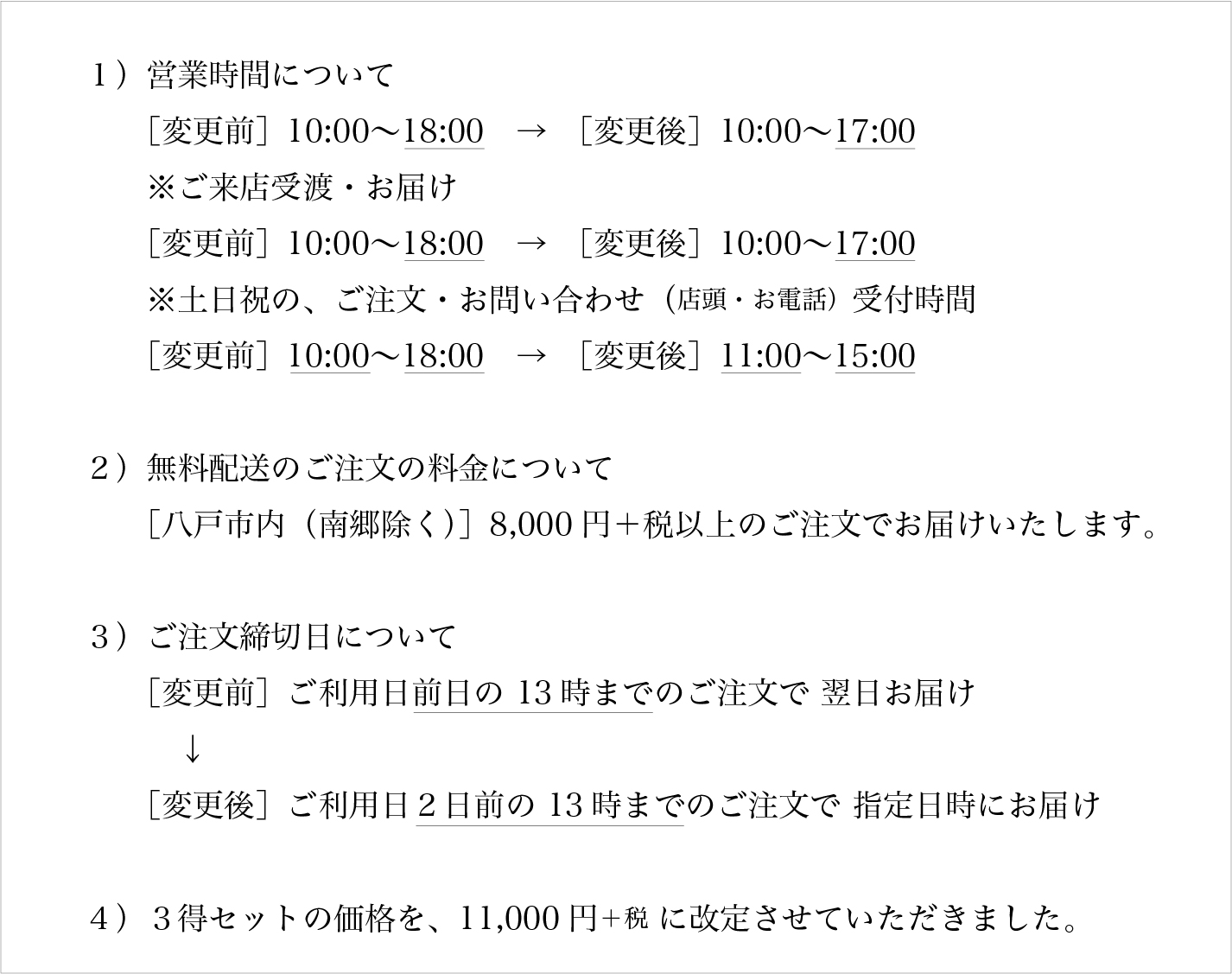 諸般の事情により、今回の夏チラシ(令和元年6月1日)より、一部商品の価格・ 営業時間等を、下記の通り改定させていただくことになりました。